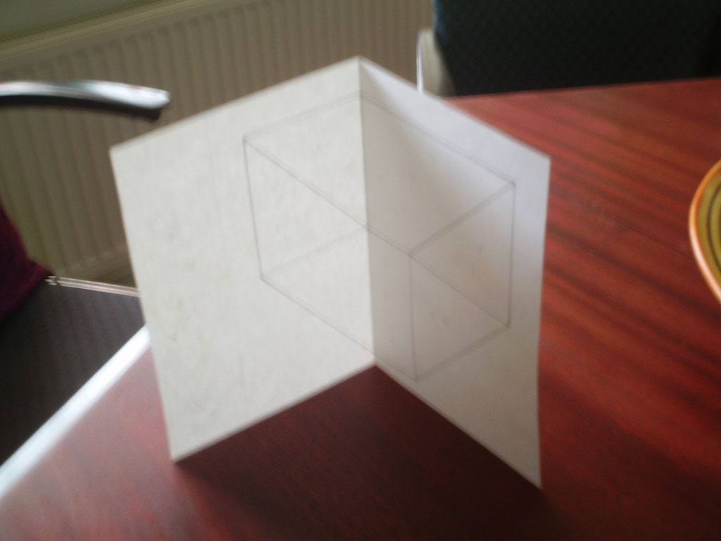 Perspectivisch experiment. Print de tekening en vouw hem dubbel op de aangegeven streepjes. Zoek vervolgens de gezichtshoek waaronder de kubus ‘verschijnt’.